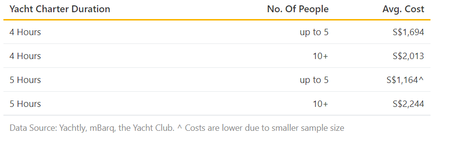 Renting a yacht can be surprisingly cheap if you split costs with a large group of people. For instance, if you charter a yacht for the standard 4 hours with a group of 5 people, each person will only pay an average of S$72-S$87 per hour depending on the day of the week. Some charters also allow for groups as large as 30, so if you want to host a large birthday party or a company outing, then the cost declines to an average of S$19 per person per hour. Of course, if you plan to charter a boat for just yourself and your spouse, then the costs will proportionally increase. Overall, the average price to charter a standard yacht for a day in Singapore is S$1,660.