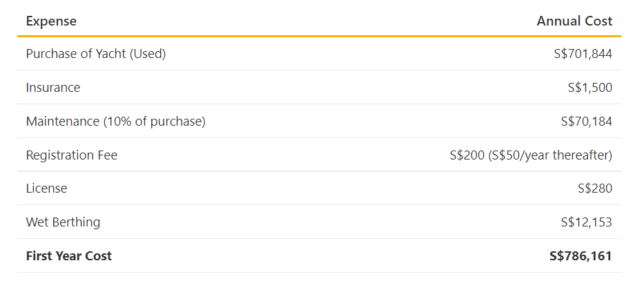 However, renting a boat every weekend can also add up significantly—roughly S$37,034 per year. If you want to do week-long trips on luxury yachts, then you may end up spending hundreds of thousands of dollars in costs per year (at this point it will be cheaper to just buy the boat). In this case, really committed sailors can potentially opt for a smaller, simpler boat in the price range of S$200,000-S$300,000. The annual costs will be less than renting a boat (S$22,894-S$32,894 per year) and you can charter it out a few times a year to help recoup the purchase costs. Furthermore, owning a boat gives you freedom to go wherever you want, whenever you want. So just like owning a car, the true value of owning a boat provides something that is hard to quantify.